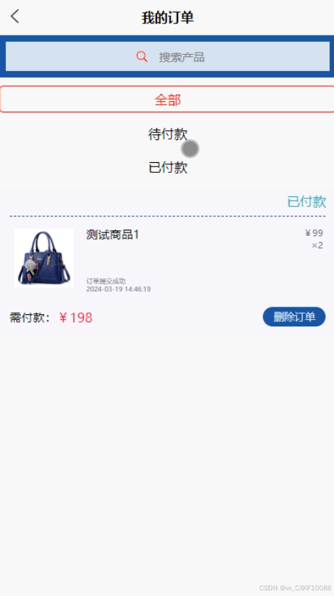 (8)我的订单管理:在旅行订房APP中,用户和管理员都能够管理订单,可以对订单进行查看、删除。如下图2.8所示。