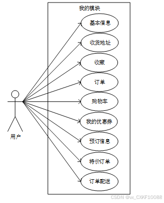 (9)我的模块:我的模块是用户独有的功能,可以在“我的”管理基本信息、收货地址、收藏、订单、购物车、我的优惠券、预订信息、特价订单、订单配送,我的用例如下图2.9所示。