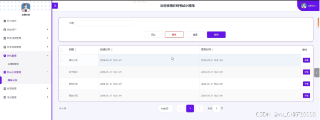 - 网站公告管理:网站公告管理界面是管理员用来管理系统中的网站公告的界面;可以对网站公告信息进行增删改查操作。