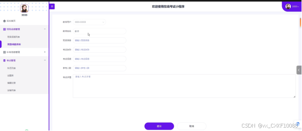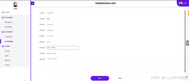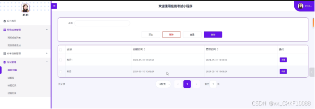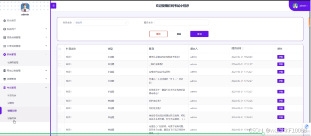- 考试管理:在“考试管理”菜单管理员对科目列表、试题库、错题记录和试卷列表进行管控,可以对科目列表、试题库、试卷列表信息进行增删改查操作;可以查询、重置和删除错题记录信息。