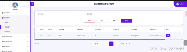- 系统用户:管理员可以查看系统用户(管理员、学生用户、教师用户)列表中某一用户的详情,可以对用户信息进行增删改查操作。