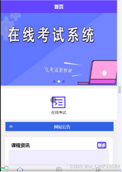 - 首页:小程序首页界面是用户访问系统的入口页面,用户可以查看首页展示的轮播图、网站公告、在线考试、课程资讯等信息。点击“在线考试”进入页面可以查看考试列表中考试科目信息,点击某个科目后面的“答题”可以进入考试页面进行答题。