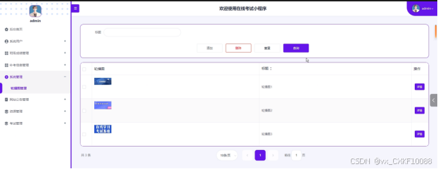 - 系统管理:管理员在“系统管理”这一菜单下对轮播图进行管控,可以对轮播图信息进行增删改查操作。