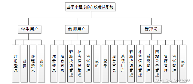 按照基于小程序的在线考试系统的功能模块,主要包括用户端(学生用户)和管理端(教师用户、管理员)这两大功能模块。