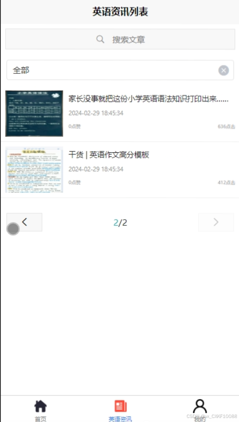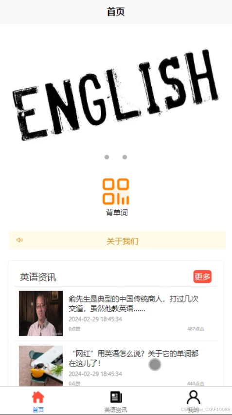 (2)首页:当用户进入英语学习小程序的时候,首先映入眼帘的是系统的首页、英语资讯、网站公告、我的基本信息、收藏等内容。