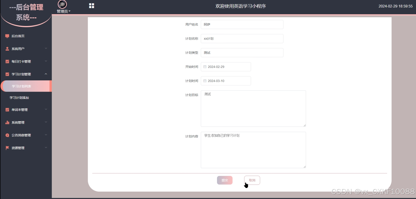 (3)学习计划管理:当管理员点击“学习计划管理”时,可查看学习计划列表和学习计划添加。点击“学习计划添加”,选择计划分类,输入用户姓名、计划名称、计划类型、计划时间、计划目标、计划内容,点击“提交”按钮,可添加新的计划。