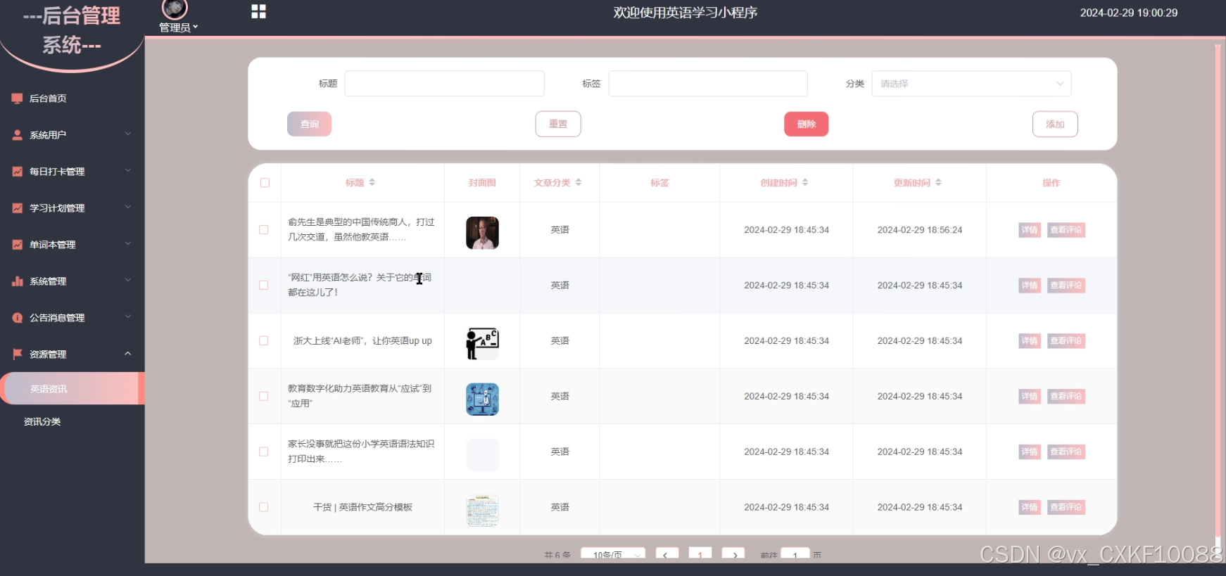 (6)资源管理:当管理员点击“资源管理”时,可查看英语咨讯和咨讯分类;如需添加新的英语资讯,点击左侧“添加”按钮,上传封面图,输入标题,选择分类,输入标签、描述和正文,点击“提交”按钮进行添加。同时可对英语资讯进行增删改除。