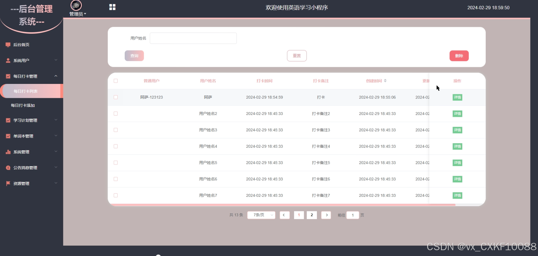 每日打卡管理:当管理员点击“每日打卡管理”时,可以查看每日打卡列表和每日打卡添加。点击“每日打卡添加”,输入打卡分类,点击“提交”按钮可添加新的分类。同时可对每日打卡管理进行增删改除。界面如下图所示。