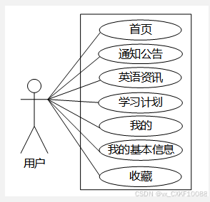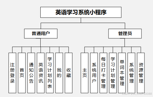 通过使用英语学习小程序,我们可以实现多种功能,从而满足用户的各种需求。该系统的功能结构如图4-5所示,具有良好的完整性和可靠性。