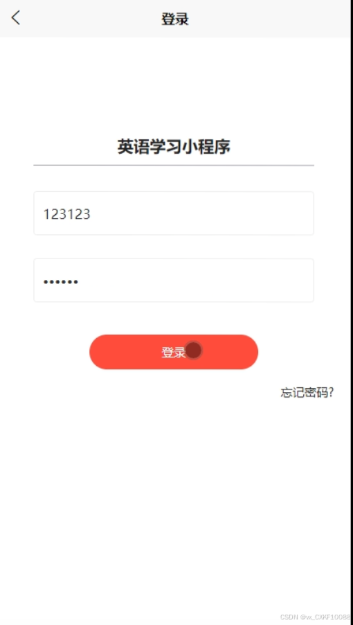 英语学习小程序前台注册后的用户是可以通过自己的账户名和密码进行登录的,当用户输入完整的自己的账户名和密码后,点击“登录”按钮后,将会首先验证输入的有没有空数据,再次验证输入的账户名+密码和数据库中当前保存的用户信息是否一致,只有在一致后将会登录成功并自动跳转到英语学习小程序的首页中;否则将会提示相应错误信息,用户登录界面如下图所示。