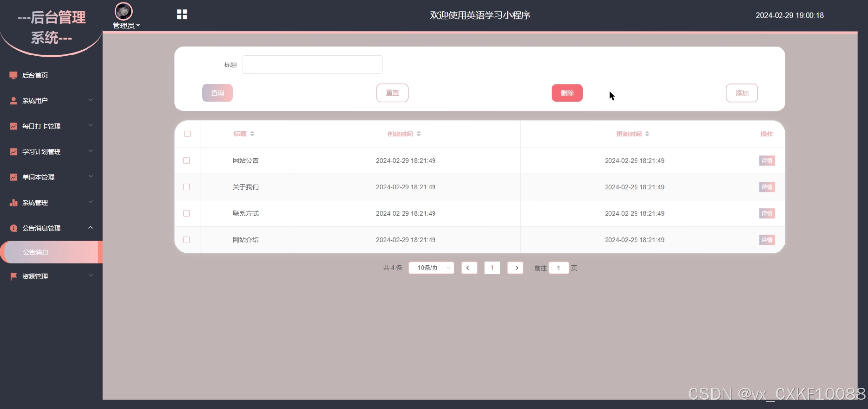 (5)公告信息管理:当管理员点击“公告信息管理”时,可查看公告信息,如需添加新的公告信息,点击左侧“添加”按钮,输入标题和正文,点击“提交”按钮进行添加。同时可对公告信息进行增删改除。
