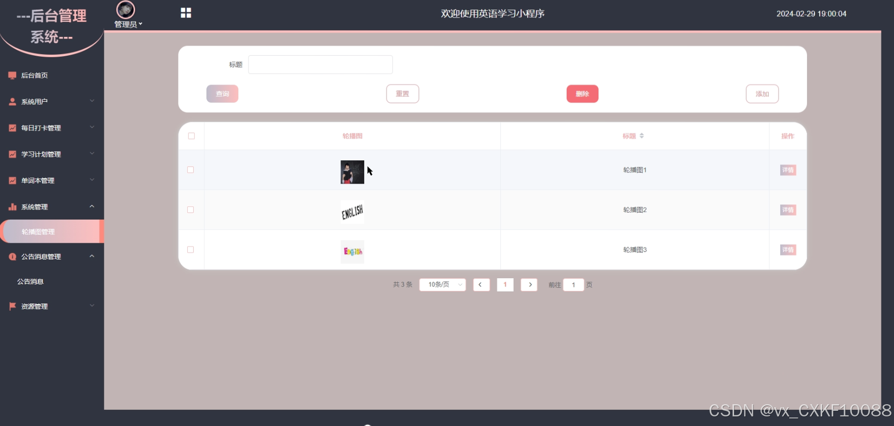 (4)系统管理:当管理员点击“系统管理”时,可查看轮播图管理,如需添加新的轮播图,点击右侧“新增”按钮,上传图片,输入标题,点击“确认”按钮进行添加。