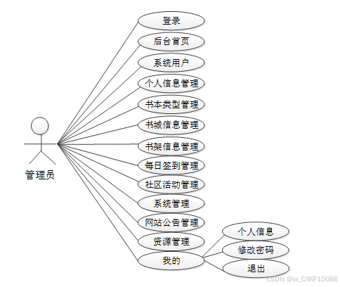 管理员功能主要包括登录、系统用户、个人信息管理、书本类型管理、书城信息管理、书架信息管理、每日签到管理、社区活动管理、系统管理、网站公告管理、资源管理、我的(个人信息、修改密码、退出):其用例图如下图2-1所示。
