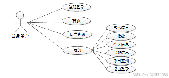 用户功能主要包括注册登录、首页、阅读资讯、我的(基本信息、收藏、个人信息、书架信息、每日签到、退出登录),其用例图如下图2-2所示: