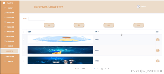 管理员可以查看轮播图列表中某一轮播图的详情,可以对轮播图信息进行查询、重置、添加和删除操作。其界面如下图5-11所示。