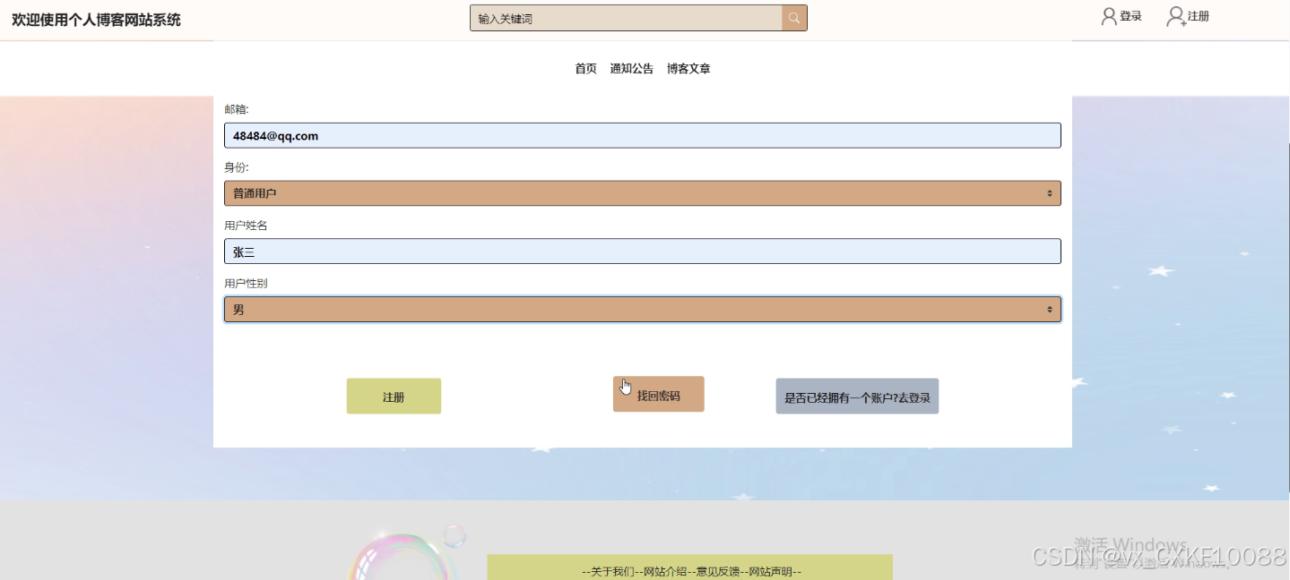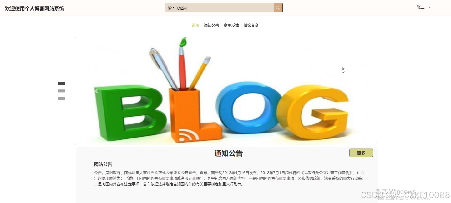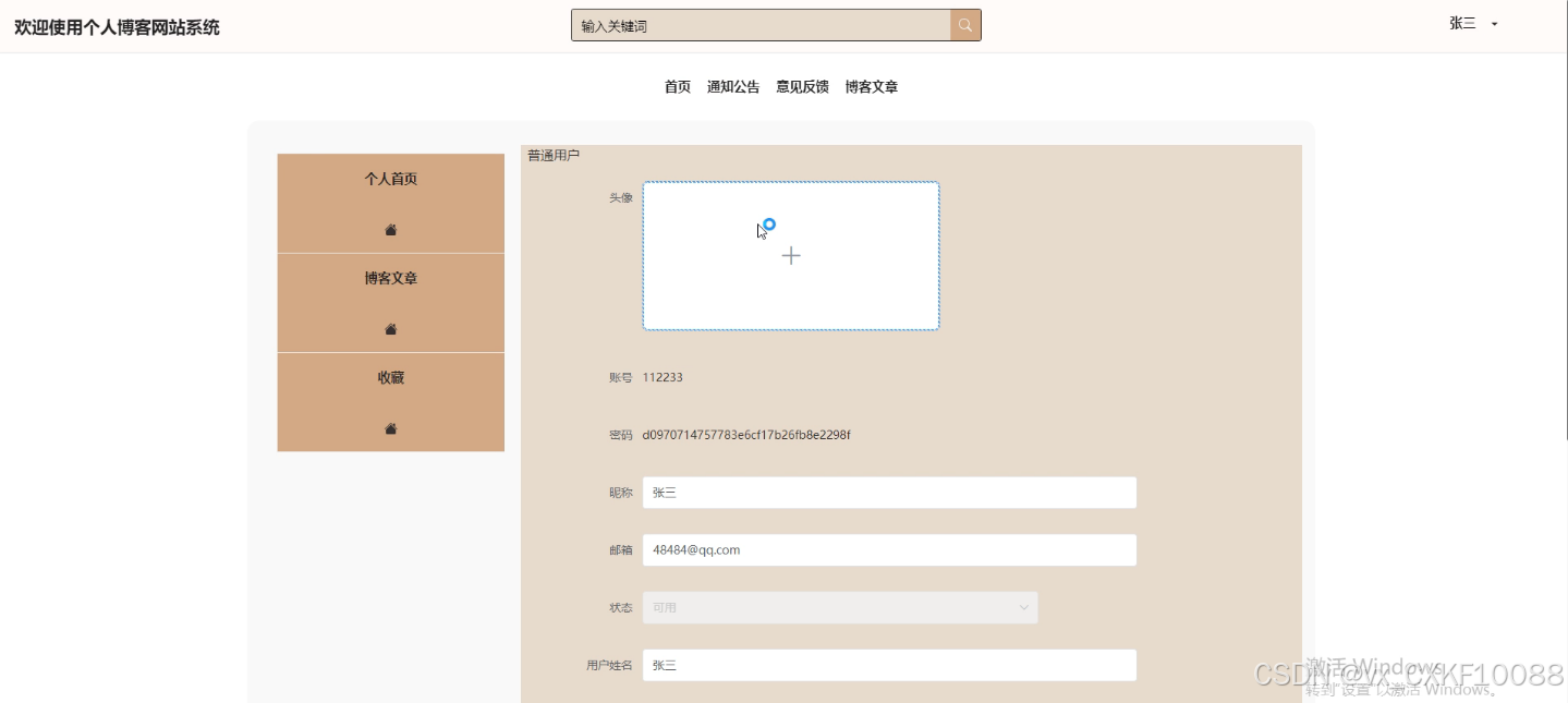进入系统可以查看:首页,通知公告,博客文章,意见反馈、我的账户、个人中心(个人首页、博客文章、收藏)等功能,还可进行相应的操作,如图4-11所示。