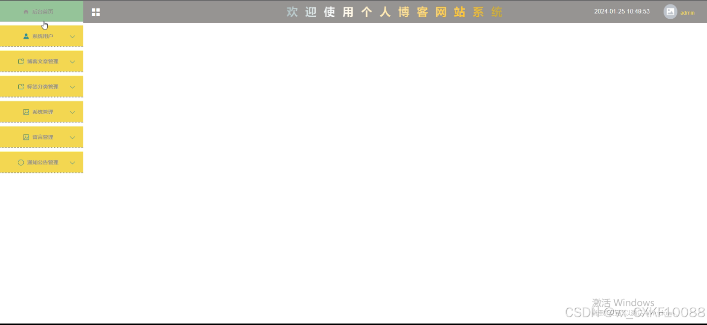 管理员进入系统后台可以查看后台首页、系统用户、博客文章管理、标签分类管理、系统管理、留言管理、通知公告管理等功能模块。还可进行相应的操作,如图4-2所示。