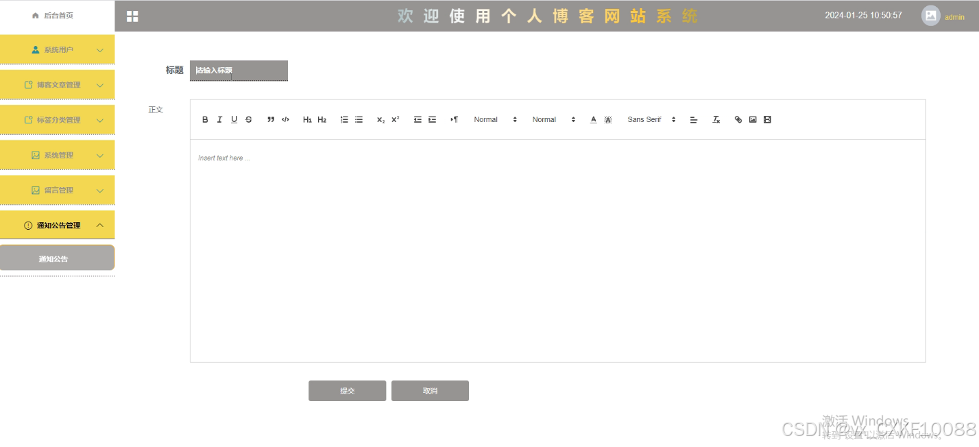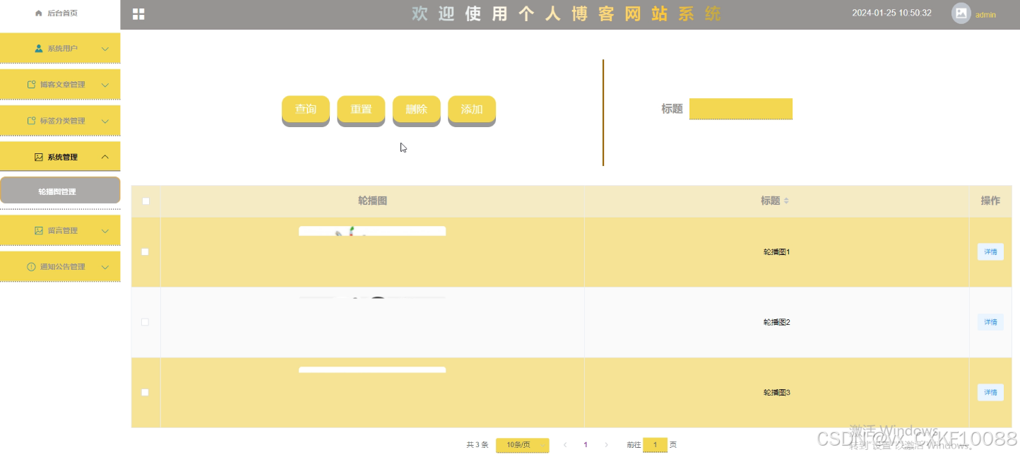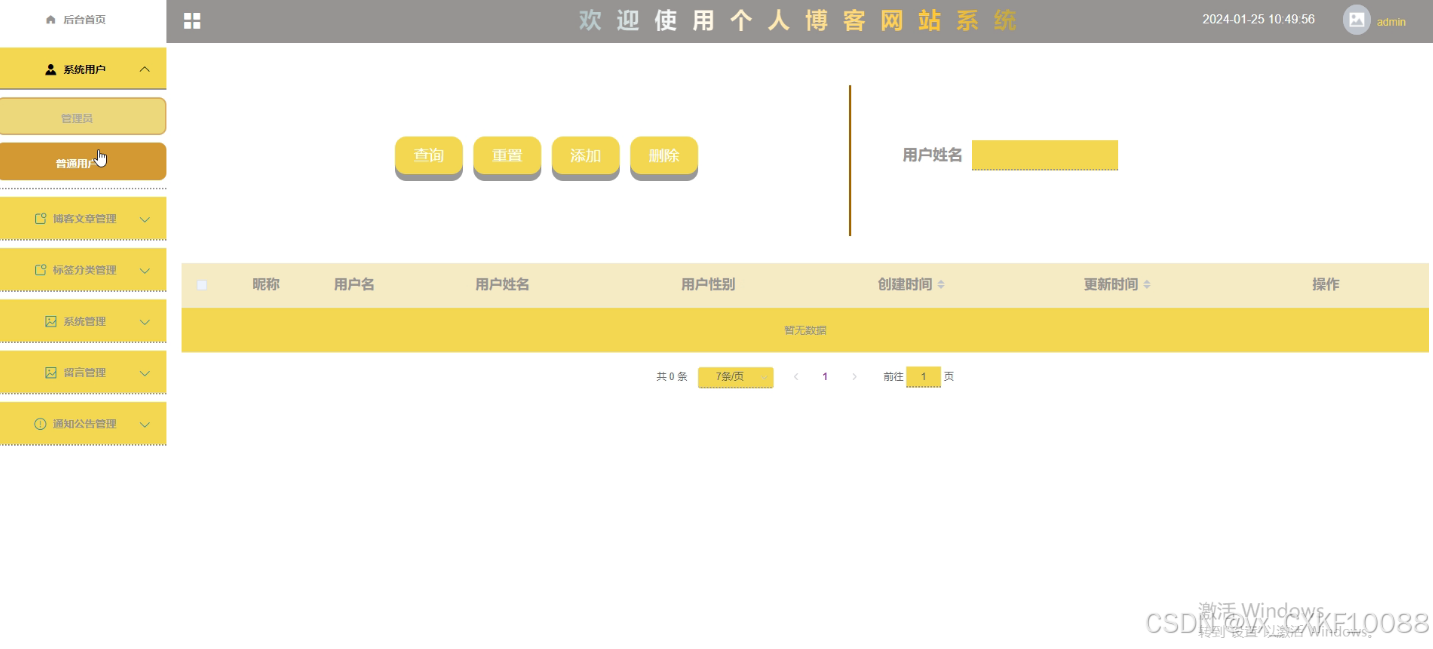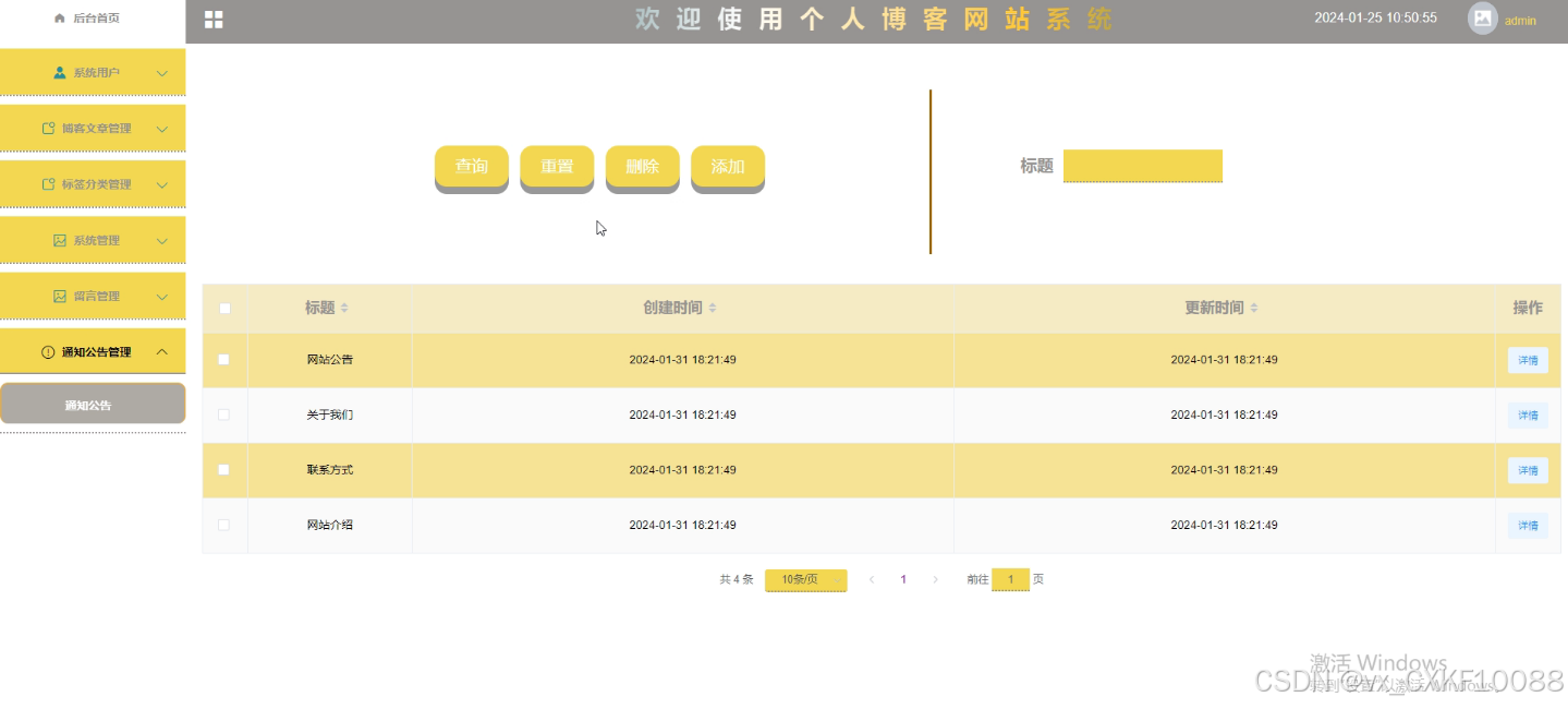 - 博客文章管理:管理员可以对博客文章进行查询、重置、添加和删除操作。