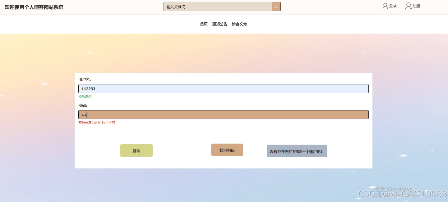 管理员登录个人博客网站系统的设计与实现,在登录页面输入用户名、密码进行登录,如图4-1所示。
