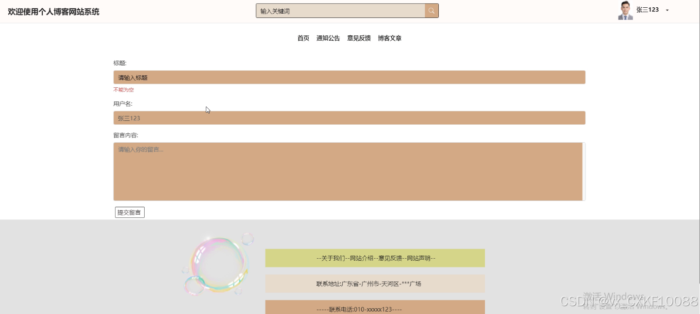 意见反馈,用户在意见反馈页面输入标题、用户名、留言内容等信息完成意见反馈提交,如图4-13所示。