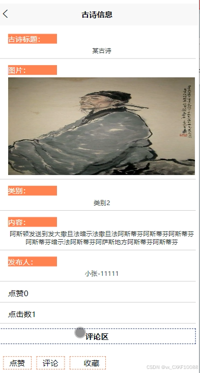 (4)古诗信息:用户点击“古诗信息”菜单可以查看所有古诗信息,可以按照条件查看古诗信息,或者输入关键词进行查询,点击可以进入古诗信息详细展示界面,在此界面用户可以收藏、点赞和评论。