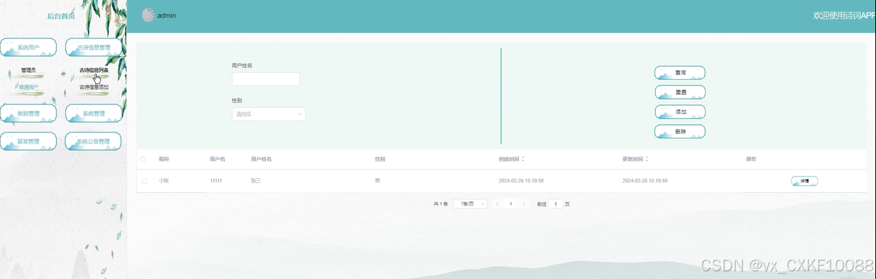 (1)系统用户:管理员可以对诗词app中的管理员以及前台注册的用户进行审核管理。