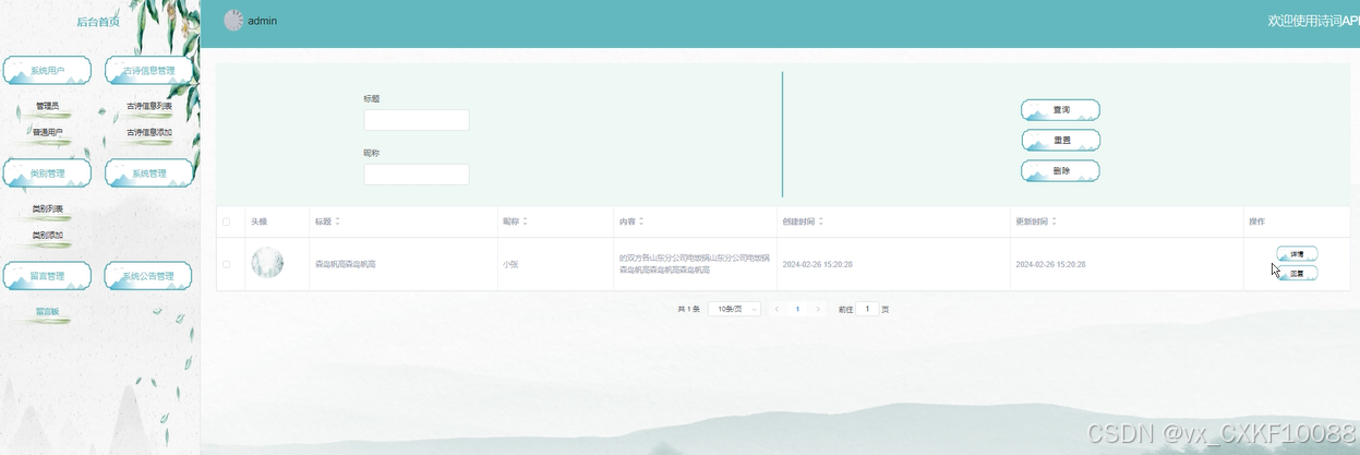 (2)古诗信息:管理员点击“古诗信息列表”会显示出所有的古诗信息,支持输入古诗标题或者图片对古诗信息进行查询,如果想要添加新的古诗信息,点击“古诗信息添加”按钮,输入相关信息,点击“提交”按钮就可以添加了,同时可以选择某一条古诗信息,点击“删除”进行删除,也可以对用户提交的古诗信息评论的信息进行管控;