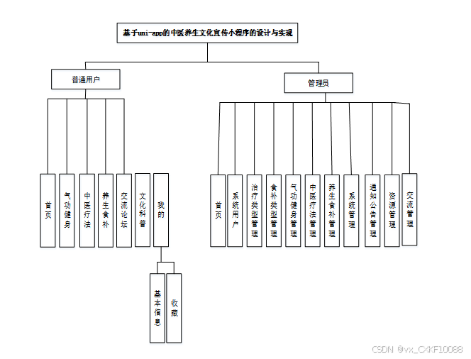按照中医养生文化宣传小程序的角色,划分了普通用户管理模块、管理员管理模块这两大部分。