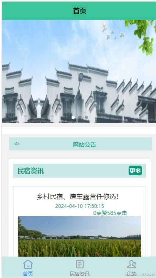 (2)民宿资讯:当房东点击“民宿资讯”这一菜单按钮,会显示管理员在后台发布的所有的民宿资讯信息,可以查看详情;进行收藏、点赞、评论等;