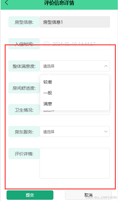 (4)评价信息:当用户点击“评价信息”这一菜单按钮,会显示相关详情,用户可以进行填写提交对名宿的评价;
