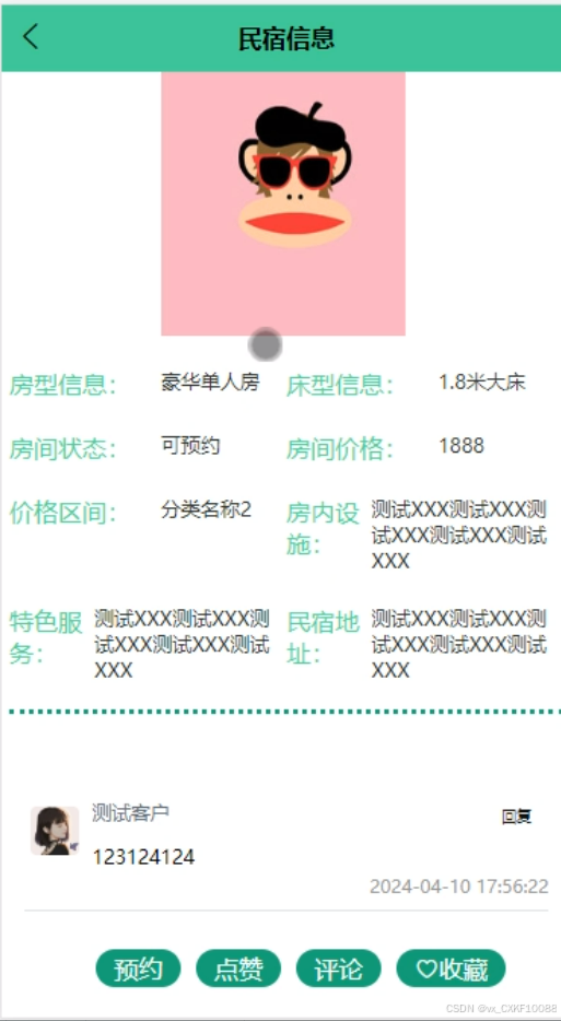当用户点击“民宿信息”这一菜单按钮,会显示管理员在后台发布的所有的民宿信息,可以查看详情,进行预约、收藏、点赞、评论等详情展示页面如图4-4所示。