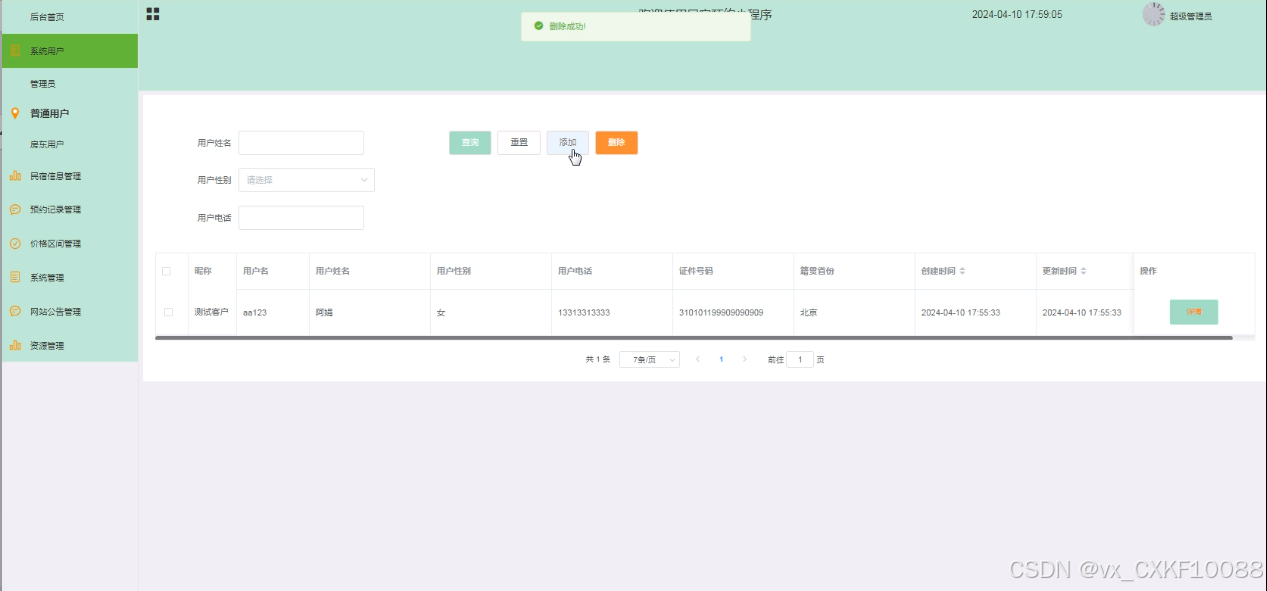 (5)系统用户管理:管理员可以对系统中所有的用户角色进行管控,包含了管理员、普通用户、房东用户等角色,如果需要添加新的用户,点击页面中的“添加”按钮根据提示输入上用户信息,点击“提交”以后在对应的用户界面就可以查看到了,可以点击用户后面的“删除”按钮直接删除某一用户。