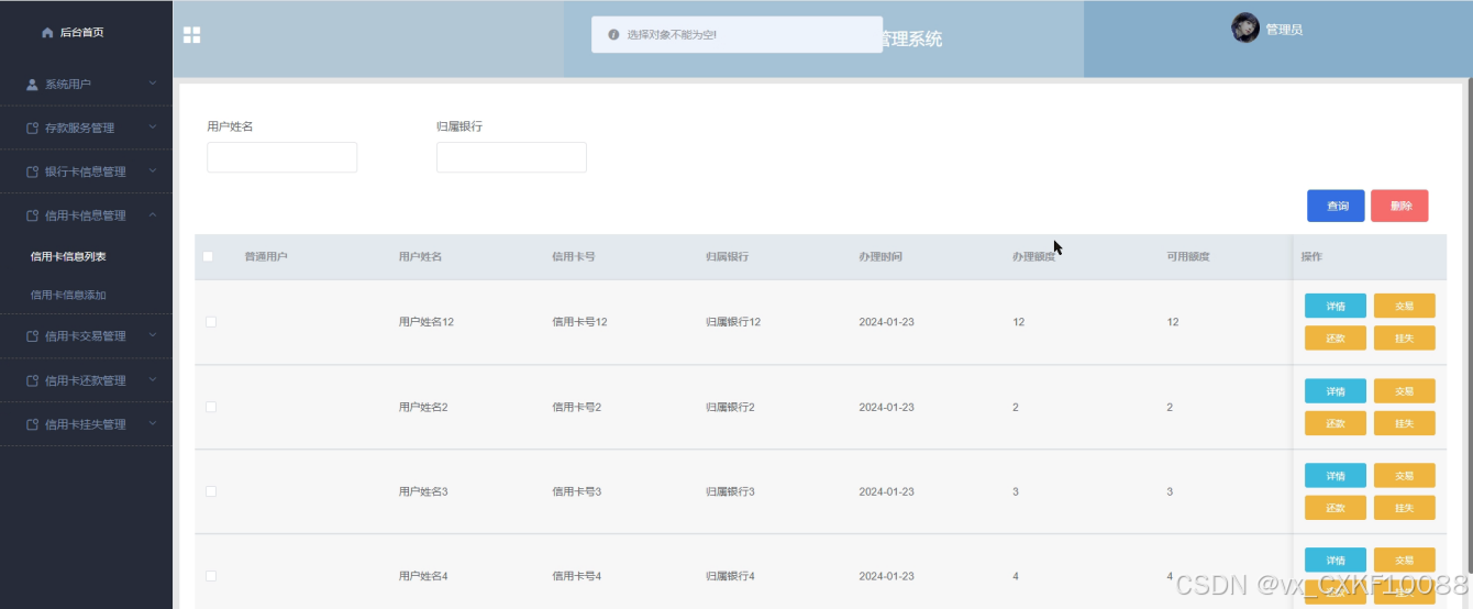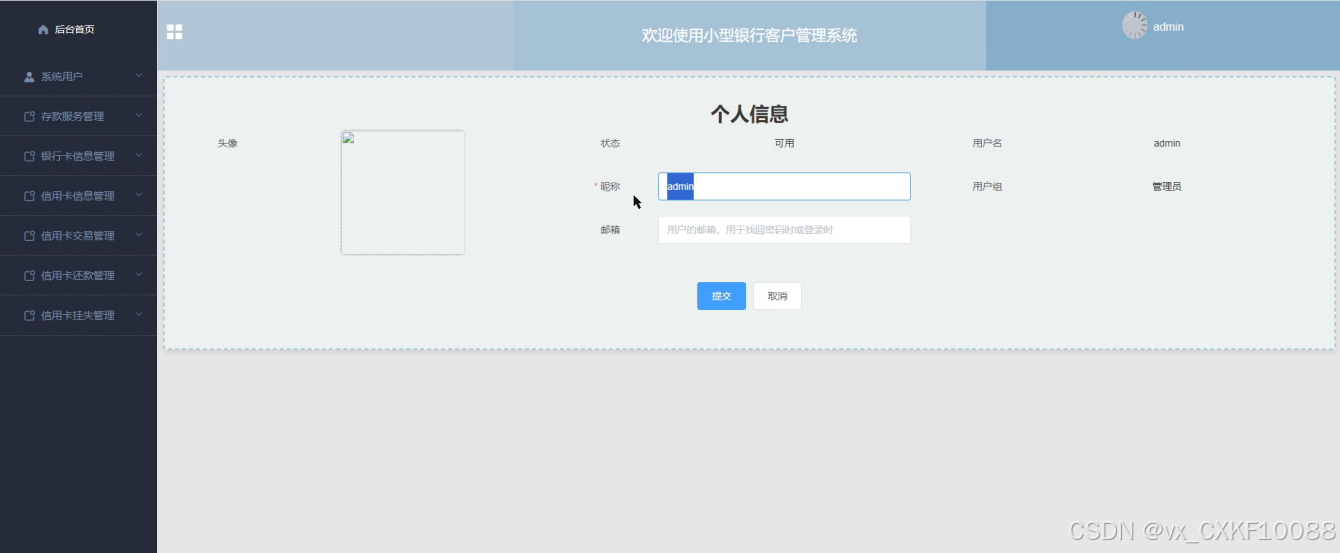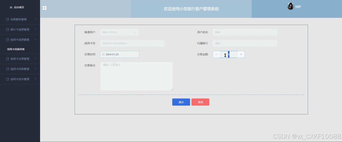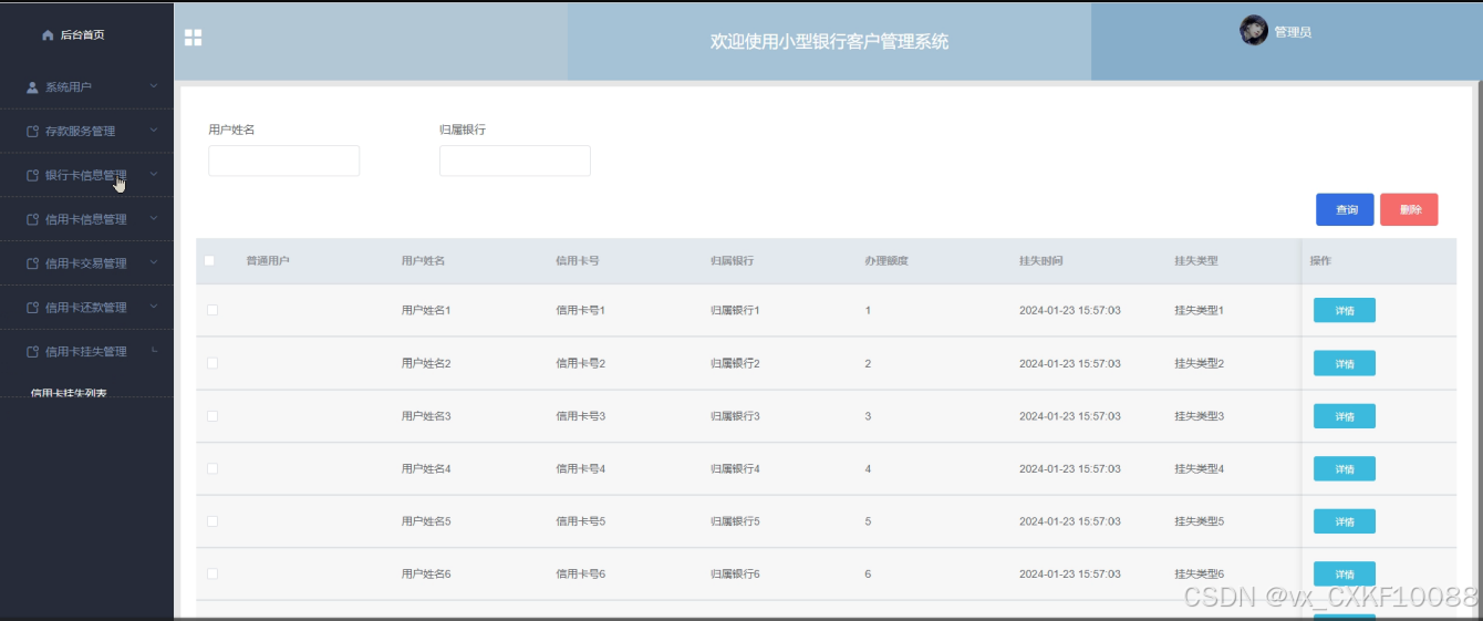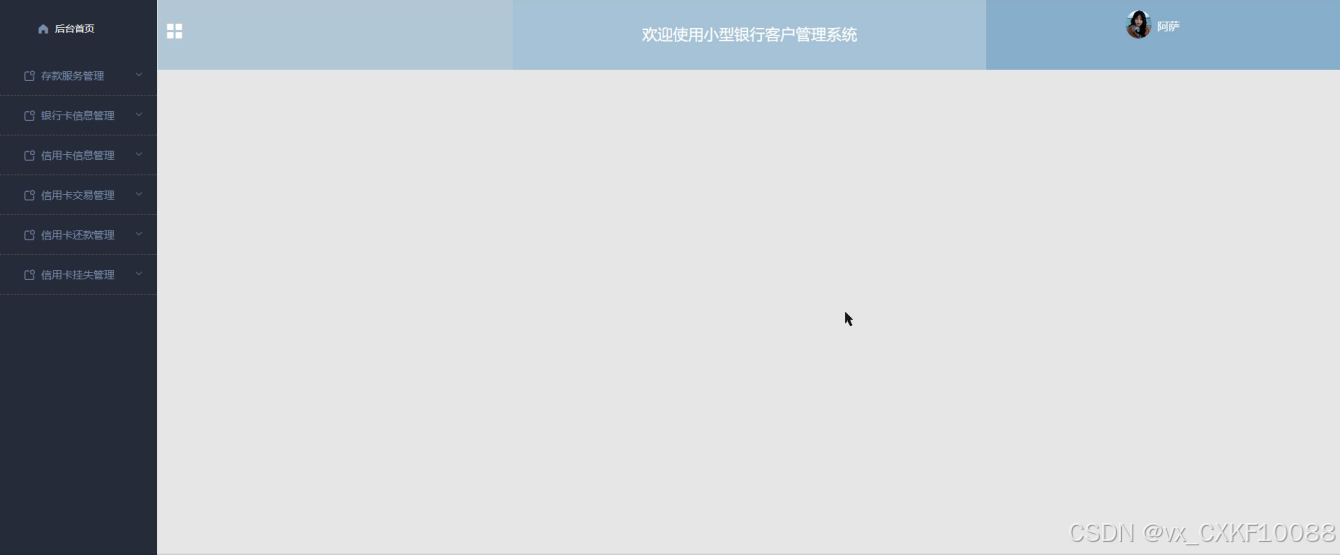 管理员登录进入小型银行客户管理系统可以查看首页、系统用户、存款服务管理、银行卡信息管理、信用卡信息管理、信用卡交易管理、信用卡还款管理、信用卡挂失管理等,如图5-8所示。