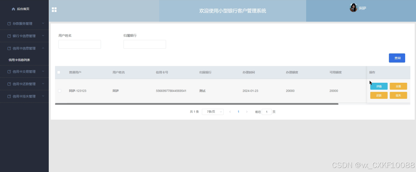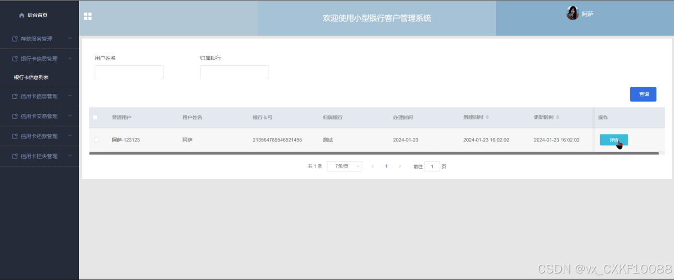The small bank customer management system utilizes modern technological means to build an efficient and intelligent customer management platform, helping small banks improve customer service quality and competitiveness. The system includes functions such as customer management, deposit service, bank card information management, credit card information management, credit card transaction management, bank card repayment management, and bank card loss reporting management. Through the customer information management module, banks can centrally manage and update customer information, including personal bank card information, credit card information, and transaction repayment operations. To meet the daily financial needs of customers, the development project of this small bank customer management system adopts Springboot technology and MYSQL database. It provides explanations for various requirements analysis of the topic, and then discusses the overall and detailed design of the website, providing a method for building the overall structure of the website.