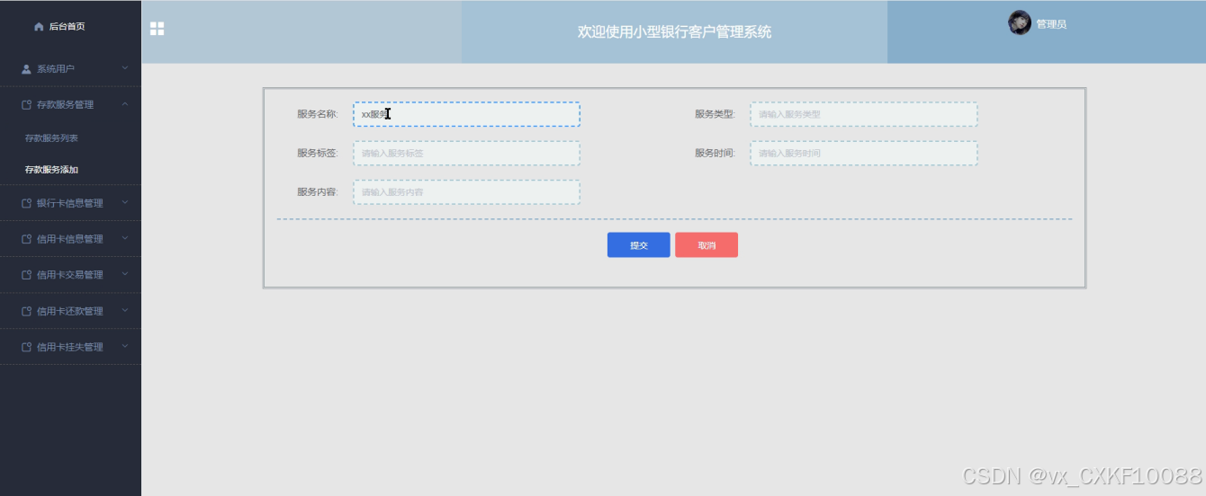 存款服务管理,在存款服务管理页面中管理员可以对存款服务详情进行增删改查操作,对存款服务信息进行维护管理等操作,如图5-9所示。
