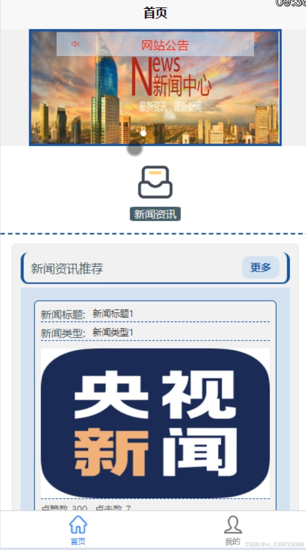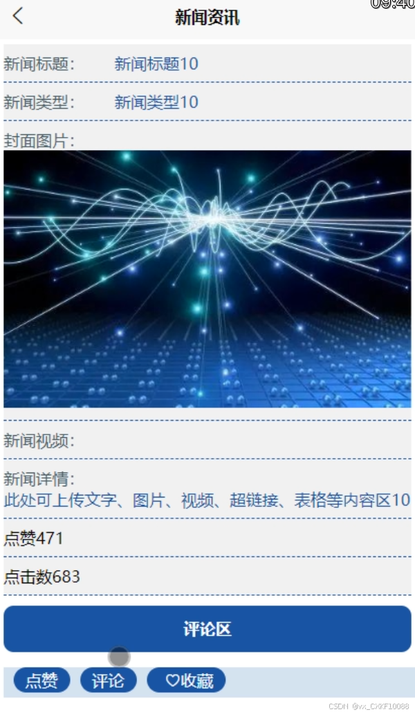 新闻资讯:在此界面,系统会根据系统过滤算法进行新闻资讯的推荐,用户可以查看相关新闻资讯信息,对某一资讯可以进行点赞收藏和评论操作,新闻资讯界面如下图4-4所示。