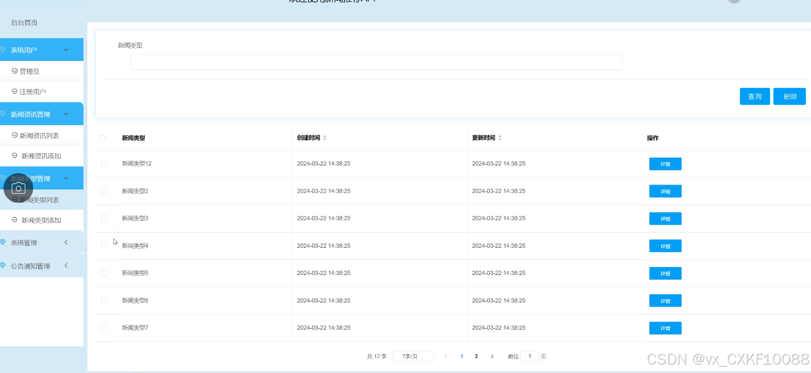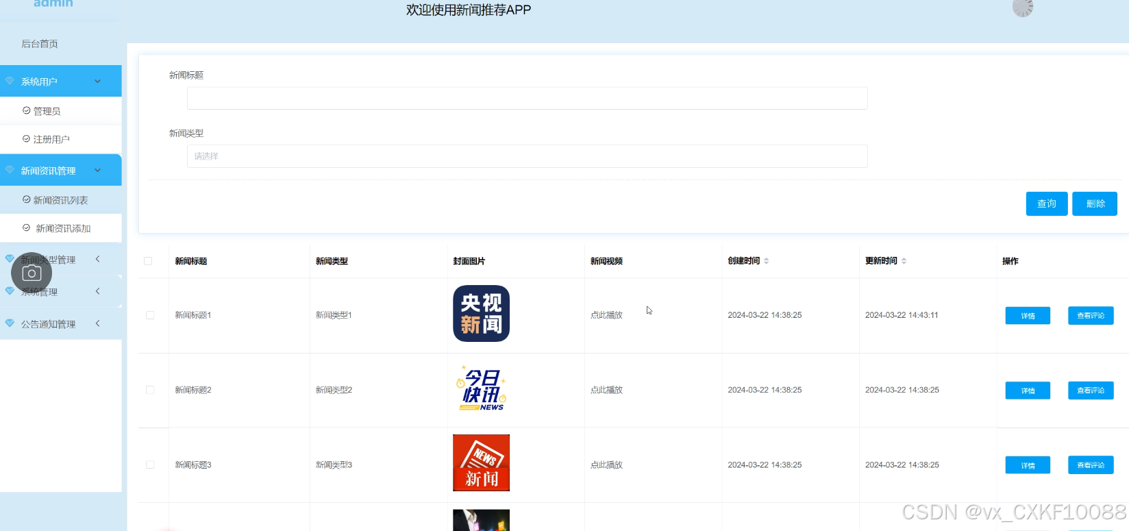 - 新闻类型管理:管理员可以查看新闻类型列表信息详情,对信息做出修改、删除操作,也能添加新的新闻类型。