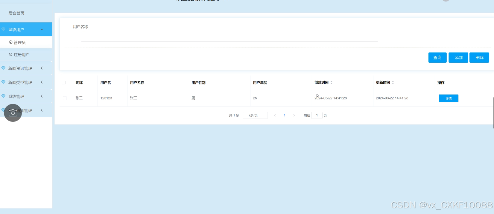 - 系统用户:管理员可以查看管理用户的基本信息详情,对信息做出修改、删除和添加操作。