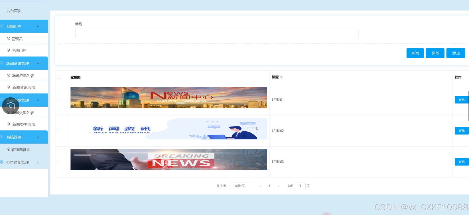 - 系统管理:管理员可以对系统轮播图进行查看管理,进行删除、修改和添加操作。