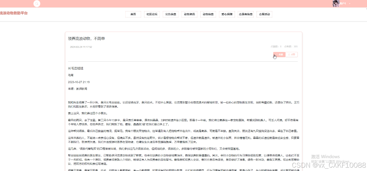 用户可以查看动物资讯列表中的某一条动物资讯详情并进行点赞、收藏、发表评论,其界面展示如下图所示。