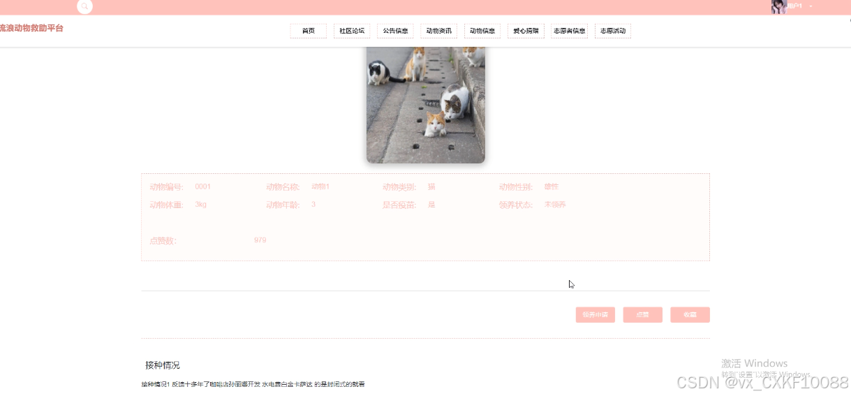用户可以查看动物信息,在查询到自己想要了解的动物信息的时候,可以进入查看详细的介绍,可以了解到该动物信息的动物编号、动物名称、动物类别、动物性别、动物体重、动物年龄、是否疫苗、领养状态、接种情况等,同时可以对点击下方的“领养申请”、“点赞”、“收藏”进行相关操作,也可以对动物信息发表评论。动物信息详情界面如下图所示。