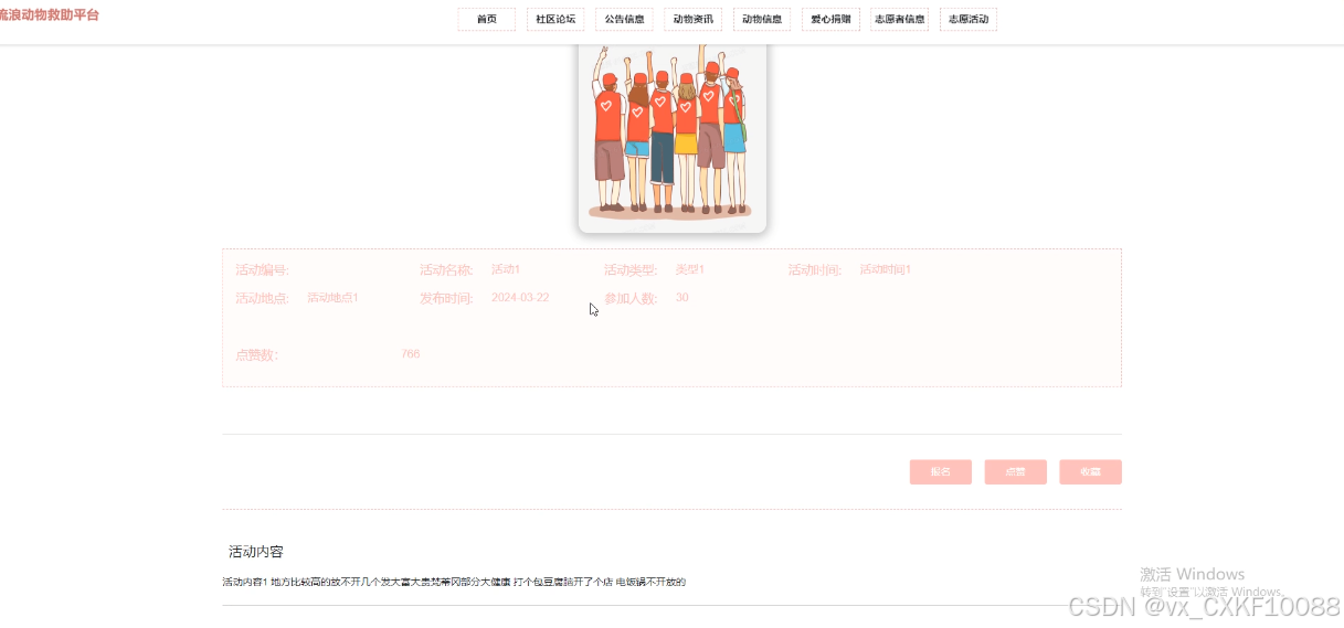 用户可以查看志愿活动信息,在查询到自己想要了解的志愿活动信息的时候,可以进入查看详细的介绍,同时可以对点击下方的“报名”、“点赞”、“收藏”进行相关操作,也可以对志愿活动发表评论。