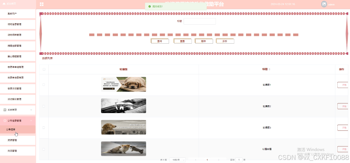 管理人员在“系统管理”这一菜单下是可以对系统内的轮播图进行添加修改的,其管理界面如下图所示。