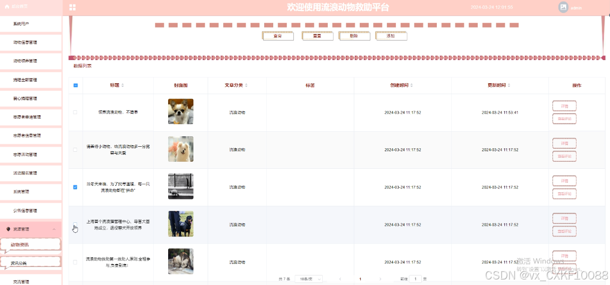 管理员执行资源管理,并可以操作相关内容,例如添加,查看,编辑和删除。通过单击“资源管理”,可以对前台展示的动物资讯及其分类进行管理。资源管理界面如下图所示。