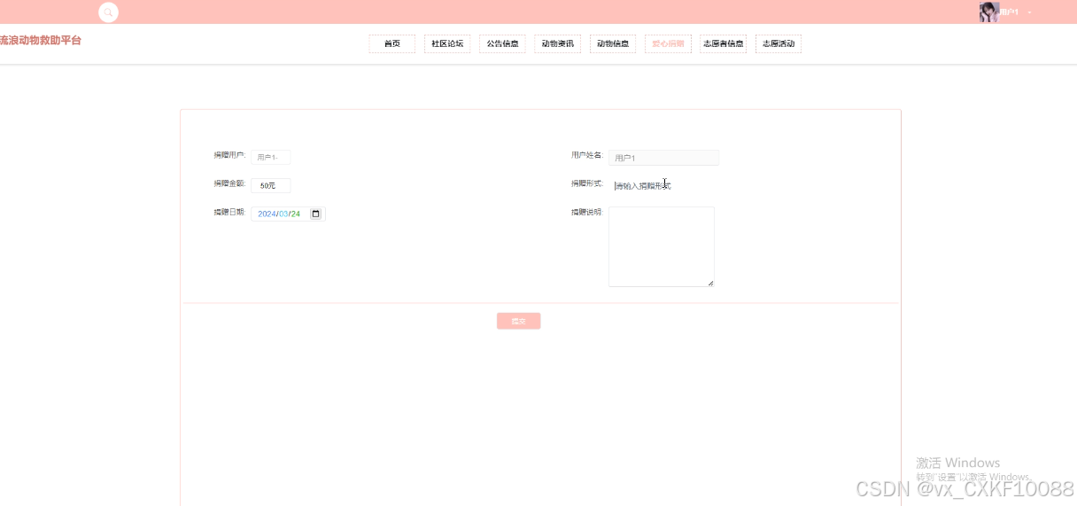 用户点击“爱心捐赠”菜单进入到爱心捐献信息填写页面,根据系统提示输入捐赠用户、用户姓名、捐赠金额、捐赠形式、捐赠日期、捐赠说明等信息,点击提交完成爱心捐赠。爱心捐赠详情界面如下图所示。