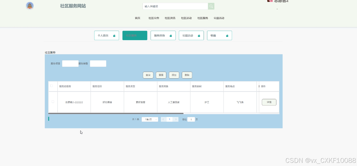 By designing and implementing this JavaWeb based community service website, the efficiency and convenience of community services can be improved, users can easily access the necessary community services, and promote the physical and mental health and social activities of residents. At the same time, it can also provide better management and supervision mechanisms, enabling community volunteer users to better coordinate and provide community services.