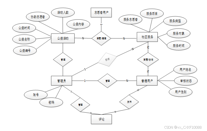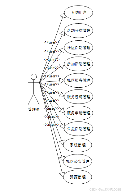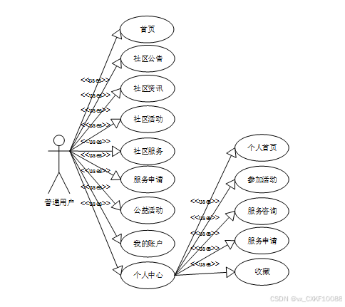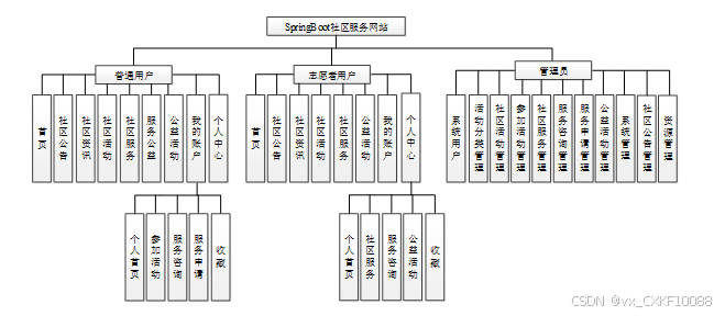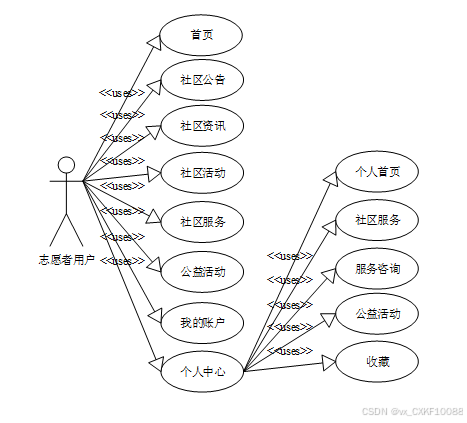 社区服务网站的功能主要分为前台普通用户、志愿者用户和后台管理员一共三个角色,前台用户注册后需要管理员审核通过后方可登录系统。