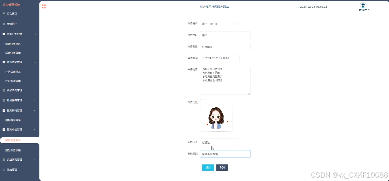 管理员点击“服务申请管理”会显示出所有前台用户的服务申请信息,点击详情可以对服务申请信息进行审核。服务申请审核界面如下图所示。