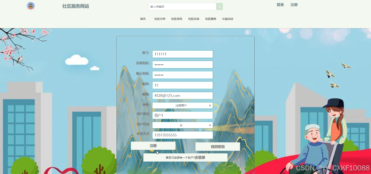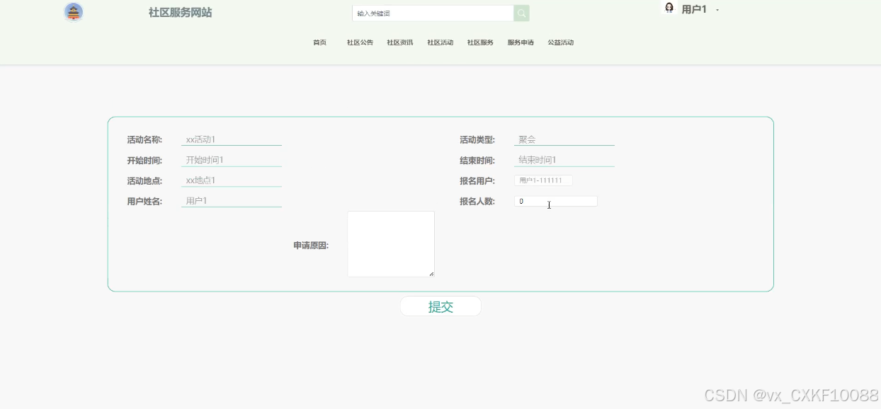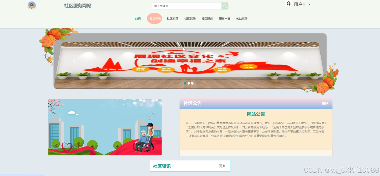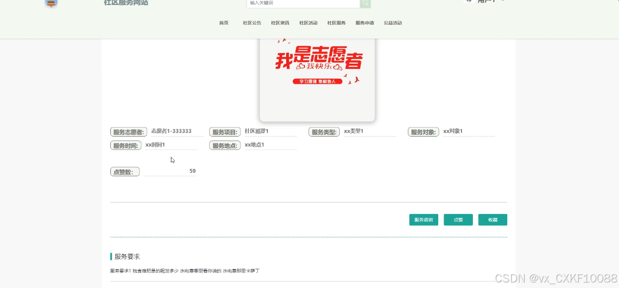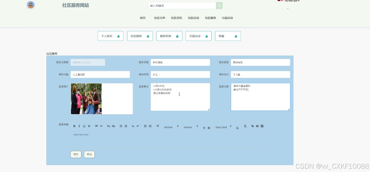 In this community service website, users can browse relevant information about community services, and at the same time, they can apply for services through the system. In addition, the community service website also provides personal information management function, where users can view and edit their personal information, so that community volunteers can provide more accurate and personalized services.