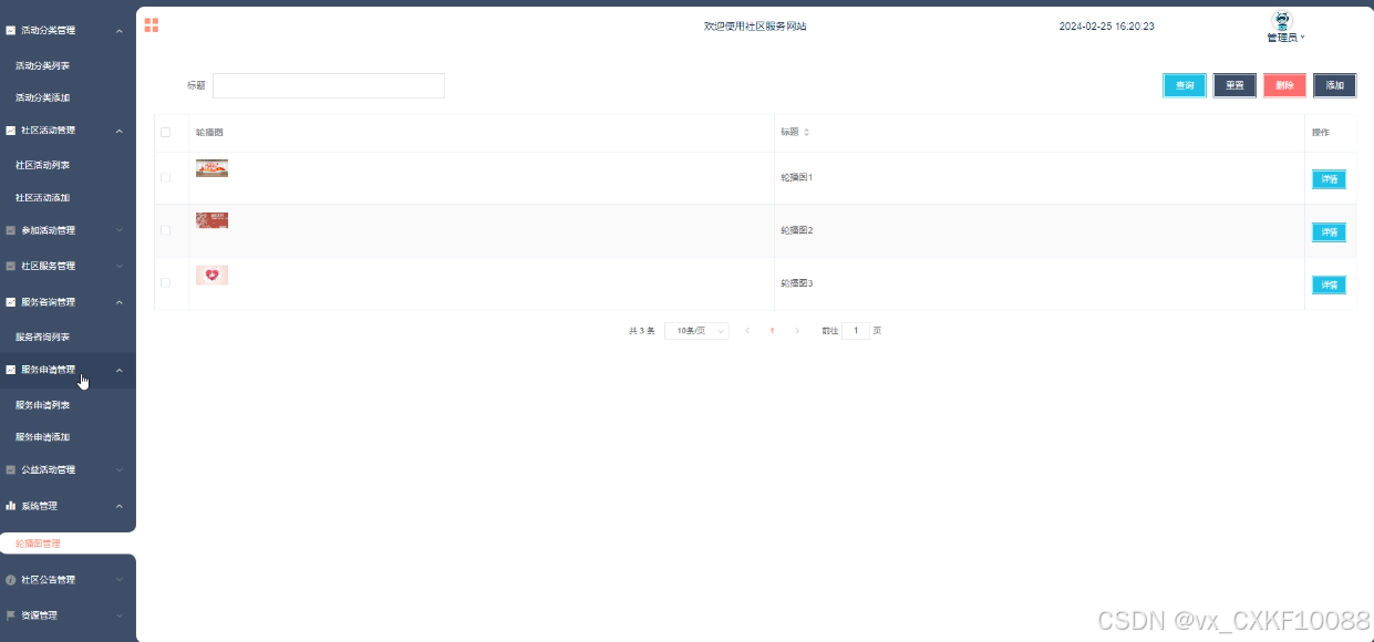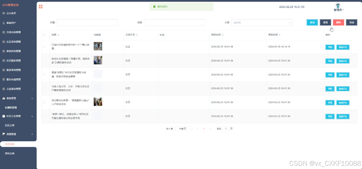 管理员点击“资源管理”会显示出所有的社区资讯信息,支持输入资讯分类或者关键词对社区资讯信息进行查询,如果想要添加新的社区资讯信息,点击“社区资讯添加”按钮,输入相关信息,点击“提交”按钮就可以添加了,同时可以选择某一条社区资讯信息,点击“删除”进行删除,也可以点击后面的“发布”按钮对社区资讯的资讯发布信息进行更新维护。